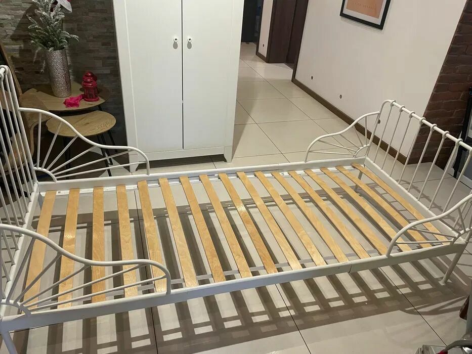 Używane łóżko z materacem marki IKEA. Solidna konstrukcja metalowa z drewnianymi listwami. Łóżko jest w dobrym stanie technicznym i nadaje się do dalszego użytkowania. Wymiary odpowiadają standardowym rozmiarom łóżek z oferty IKEA.Szerokość 85cm
